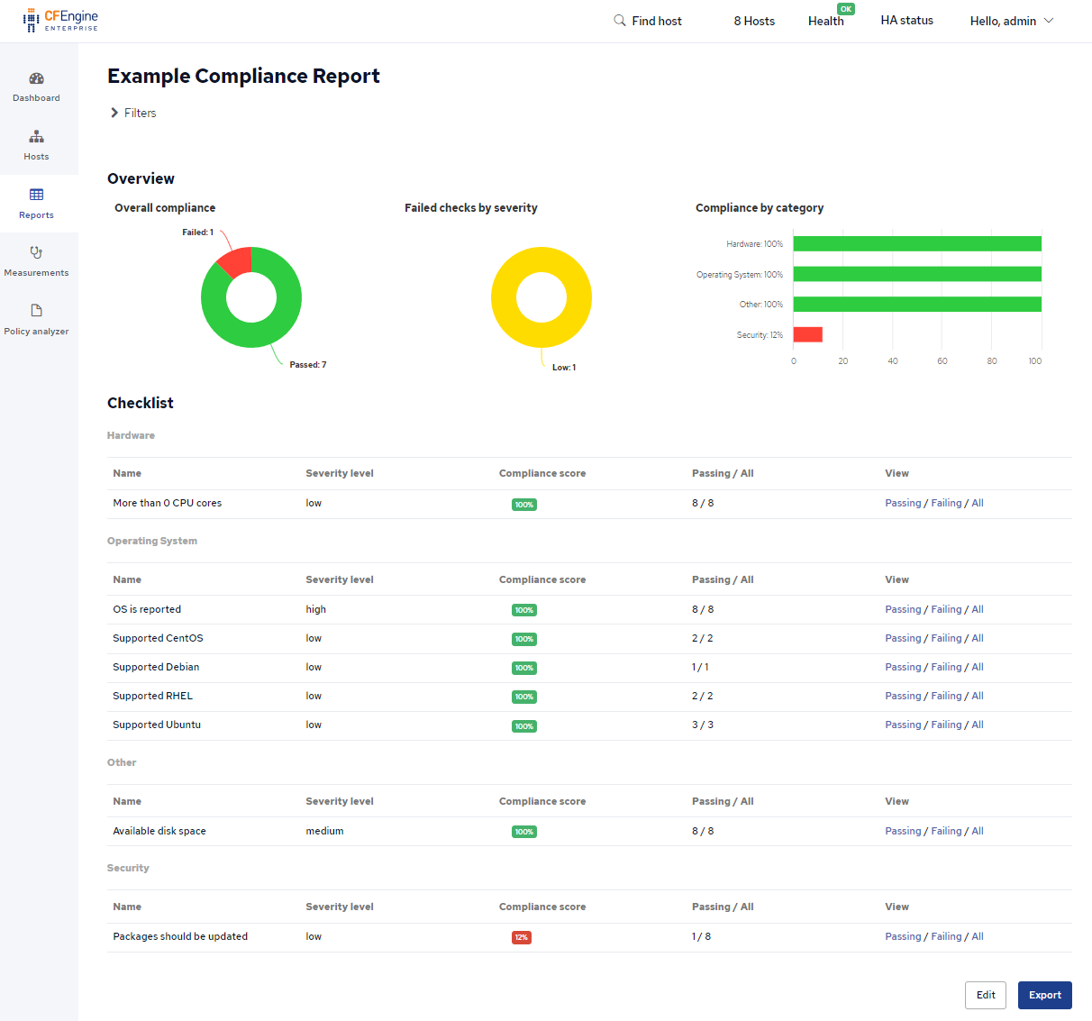 Compliance reports allow you to specify your requirements for your infrastructure as checks, and easily see which hosts are compliant and which ones are not. The checks are grouped into categories and you can specify that some checks only apply to some hosts. In Mission Portal, there is already an example compliance report which gives you a good idea of the things you can do with them: