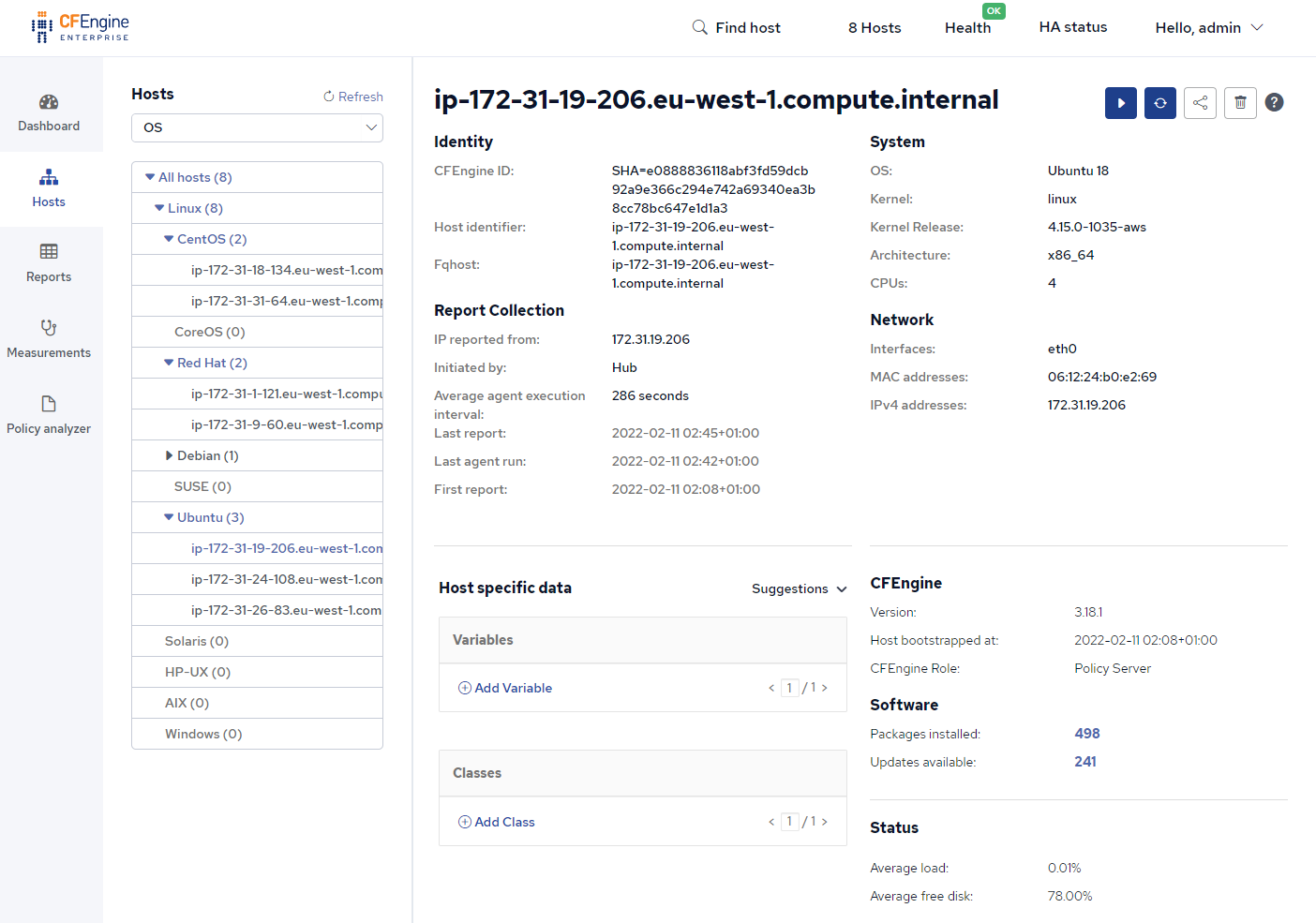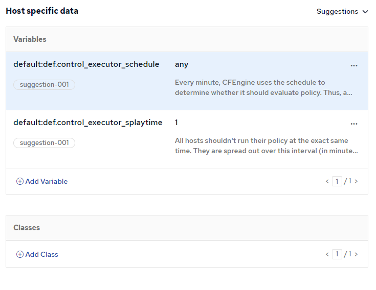 In the Host specific data section you can assign CFEngine variables and classes to that host, changing the behavior of the policy running there. If you haven’t started writing any policy yet, the Suggestions menu can be used to make some changes to what the default policy is doing, such as making the agent run every minute instead of the 5-minute default: