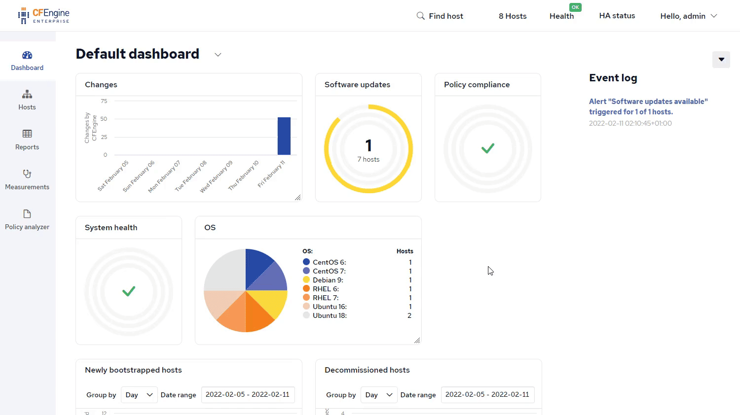 After setting up your CFEngine Hub, adding modules and deployed your first policy set, it’s appropriate to get familiar with the CFEngine Web UI, Mission Portal, and some of it’s useful features. This is by no means an exhaustive list of everything Mission Portal offers, but a good introduction for new users. If you haven’t already, open your web browser and put the IP address (or hostname) of your CFEngine Hub in the address bar. For example: