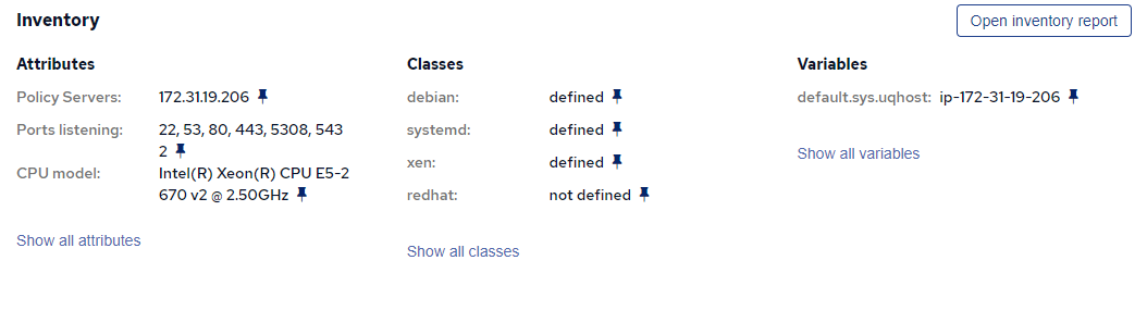 Inventory reports allow you to easily get an overview of all your hosts, and what is on them. Each host in your infrastructure gets a row in the inventory report. The columns can be customized so the report shows the data you care about: