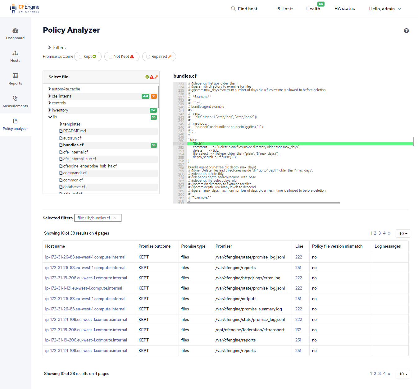 You can change the filters to see the outcomes of everything your policy does. Drill down to individual policy files and lines of policy and see which hosts it’s failing on and what the relevant log messages are.