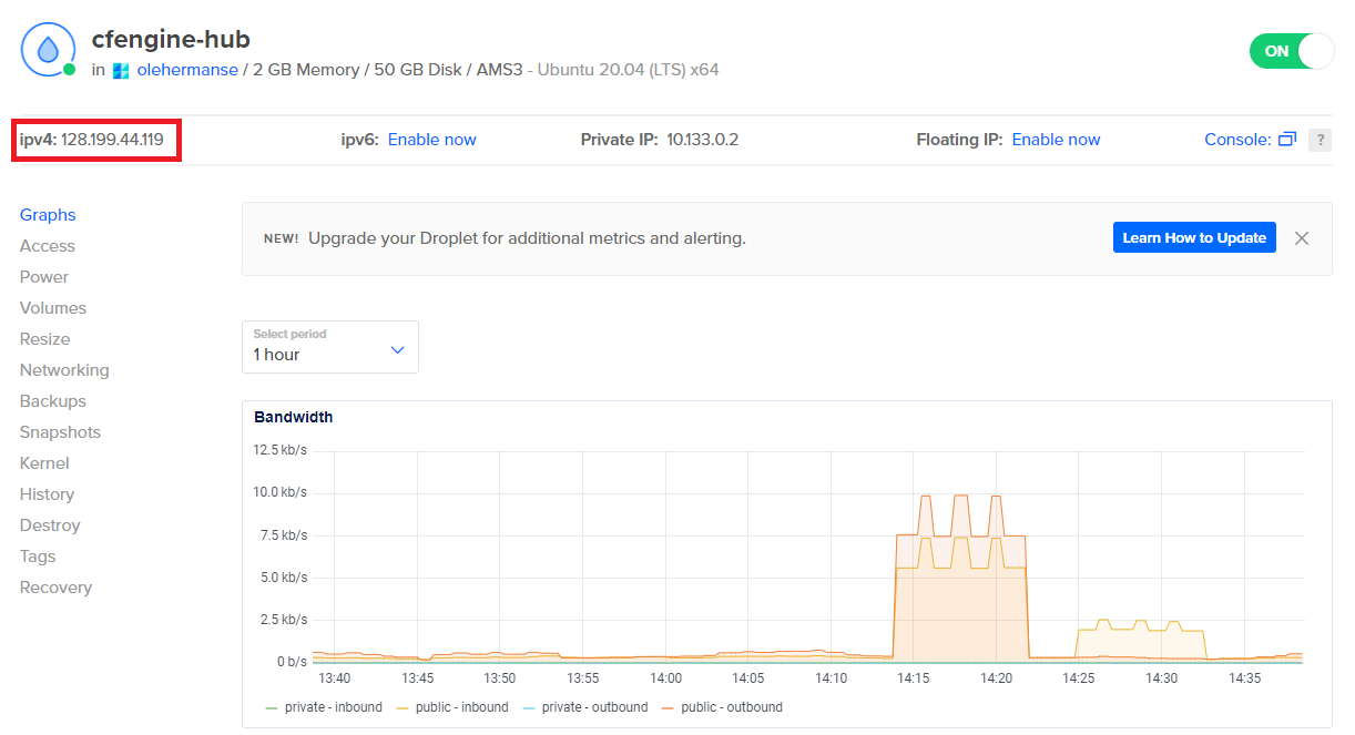 Spawn an Ubuntu 20.04 Linux Virtual Machine using the web GUI (in Digital Ocean, these are called droplets). Find the IP address of your virtual machine, and the username so you can log in with SSH. For example, in Digital Ocean, the username is root, and the IP might be 128.199.44.119 (found in top left of droplet screen as “ipv4”):